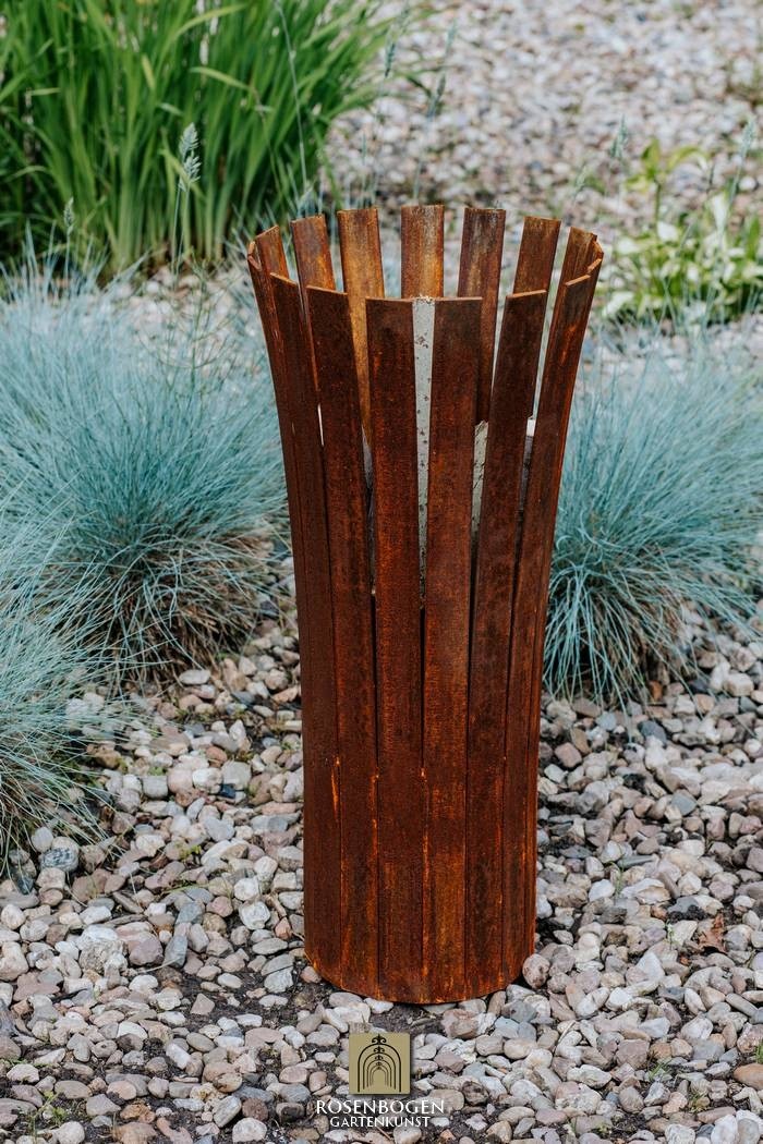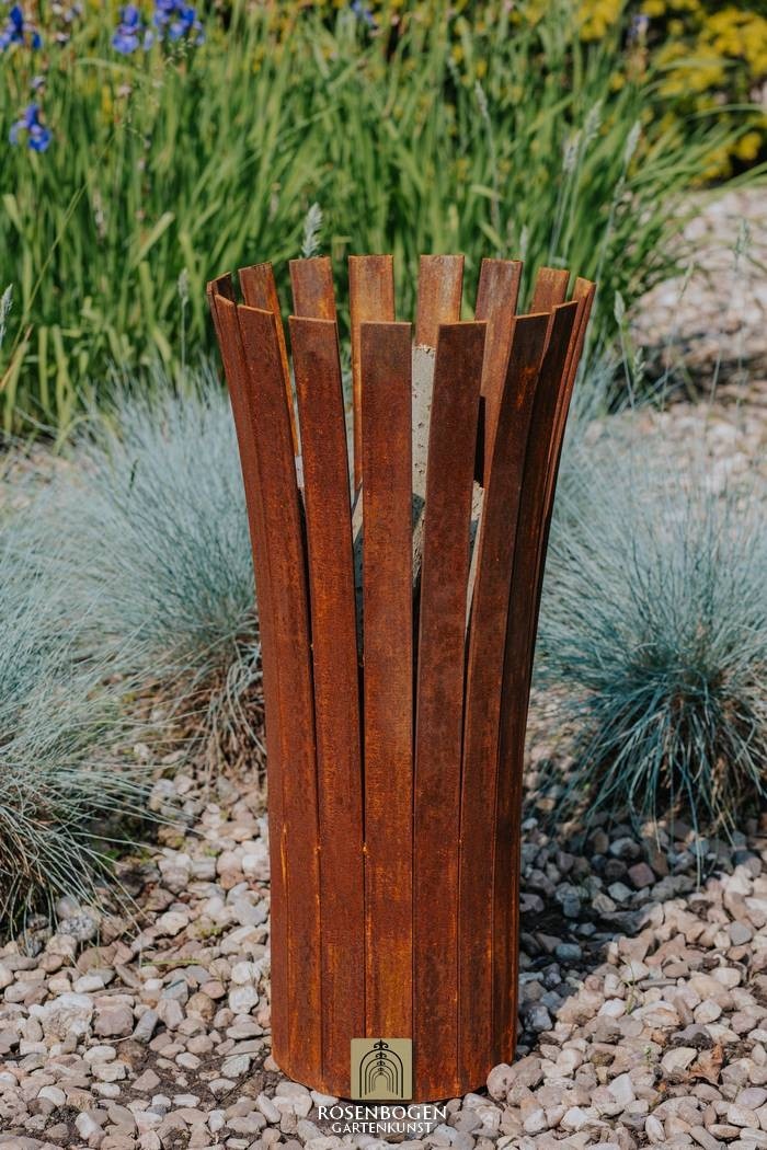Gefertigt aus 40x4 mm Flachstahl und 17 kg schwer, überzeugt Aurel durch seine hohe Stabilität und Wetterbeständigkeit. Die natürliche Rostpatina verleiht ihm einen warmen, rustikalen Look, der sich harmonisch in jede Umgebung einfügt. Die vertikalen Streben sorgen für optimale Luftzirkulation und ein lebendiges Flammenbild.