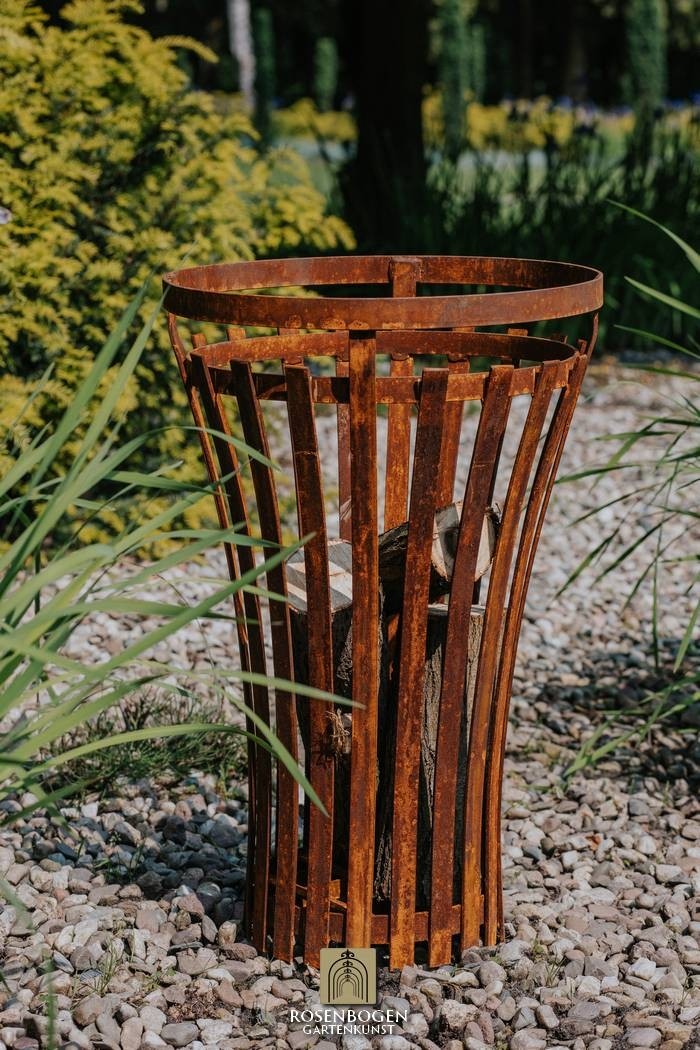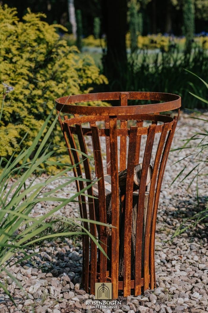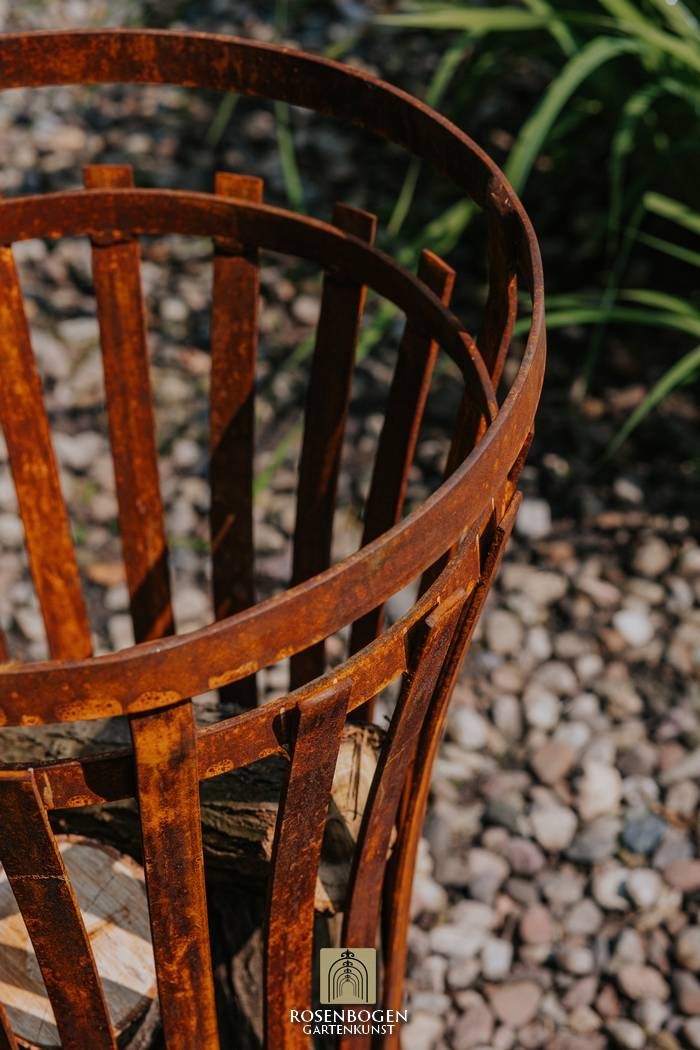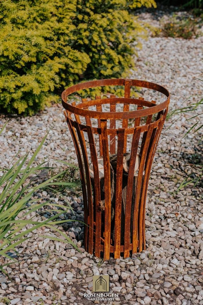 Die natürliche Rostpatina verleiht dem Feuerkorb eine warme, erdige Ausstrahlung – perfekt für moderne wie rustikale Gartenkonzepte.