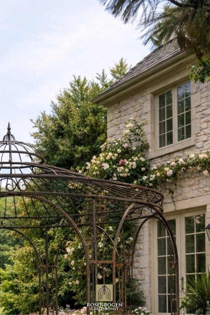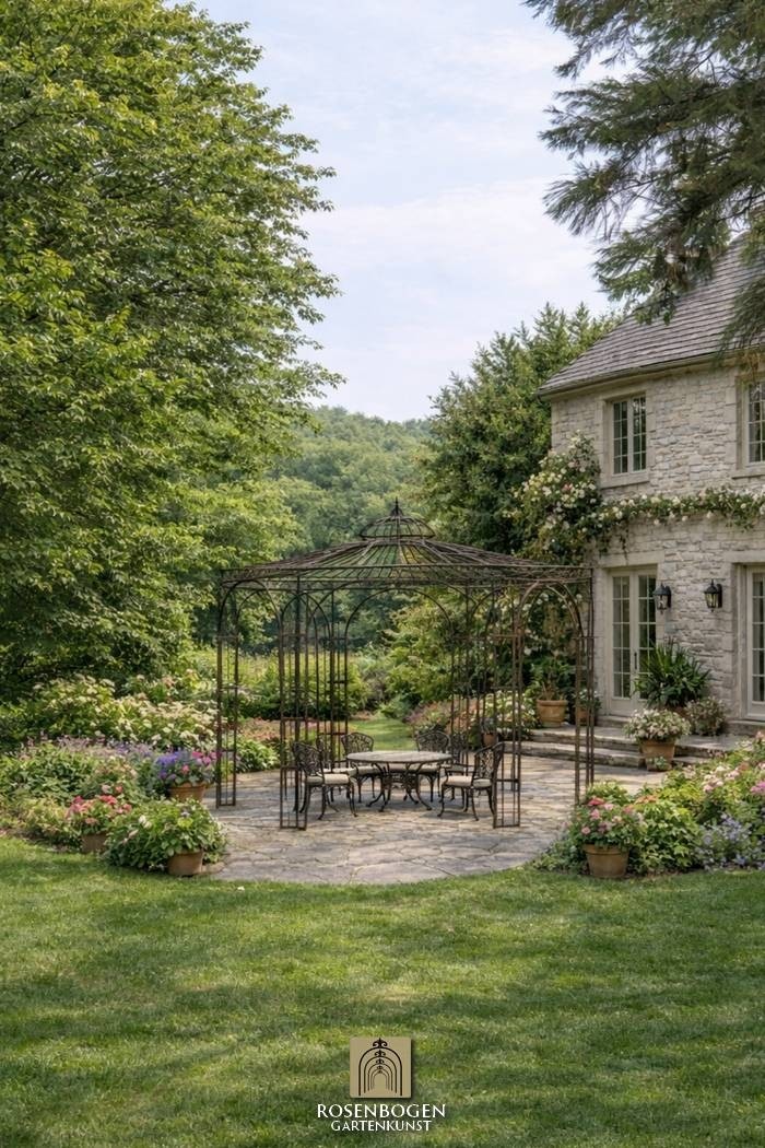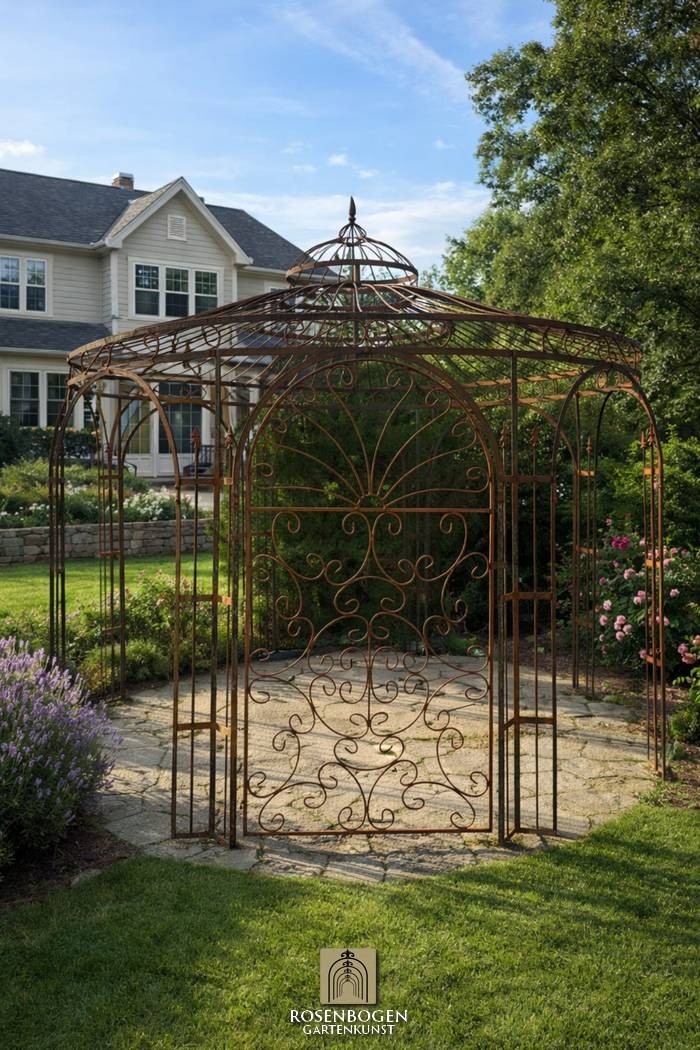 Die massive Stahlkonstruktion bietet eine zuverlässige Unterstützung für Kletterrosen, Clematis, Weinreben und andere Rankpflanzen. Mit der Zeit kann der Pavillon vollständig begrünt werden und verwandelt sich in eine beeindruckende grüne Gartenarchitektur, die Schatten spendet und gleichzeitig eine besondere Atmosphäre schafft.