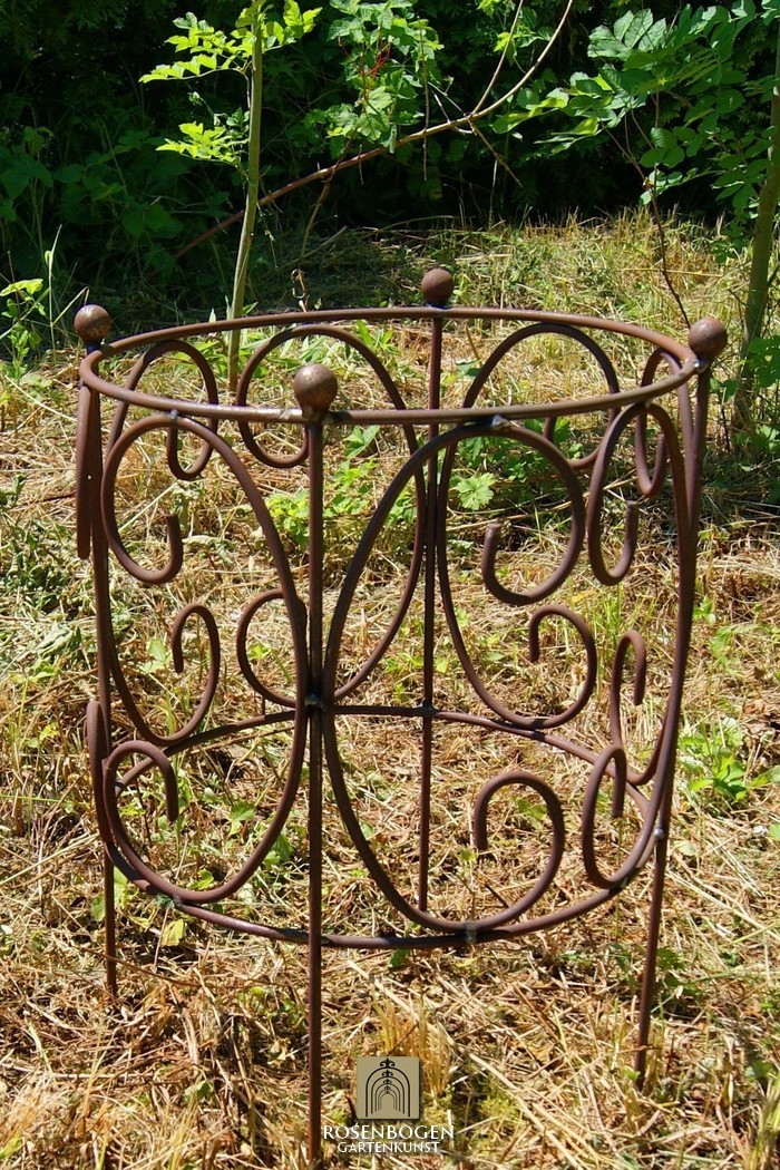 Das massive Staudenhalter RING ist aus Draht gebaut. Die Standfläche besitzt einen Durchmesser von 43 cm. An diesem stabilen Rankgerüst finden alle mögliche Pflanzen wie Kletterrosen, Clematis und andere Rankpflanzen einen sicheren Platz. Die Seitenelemente können mit 2x verfügbaren Bohrlöchern im einem Untergrund befestigt werden.