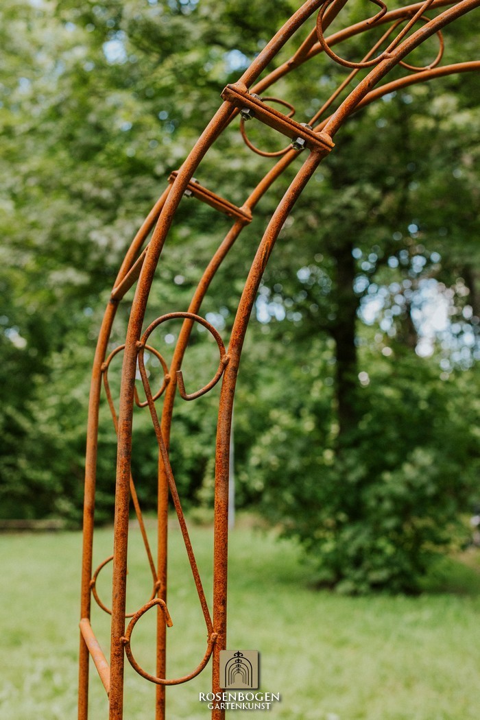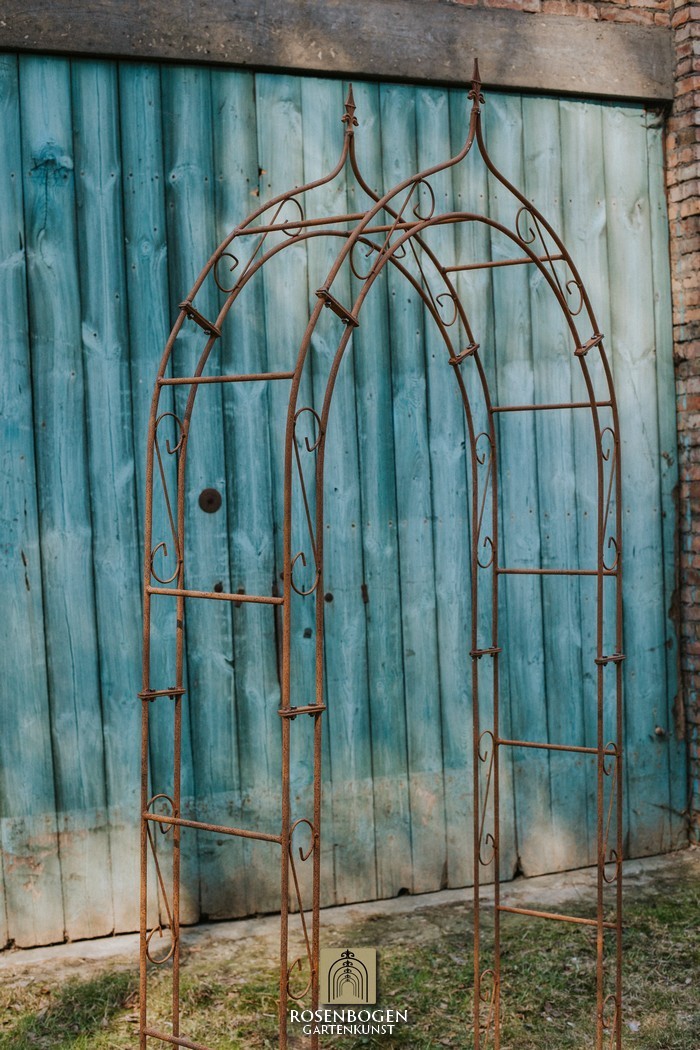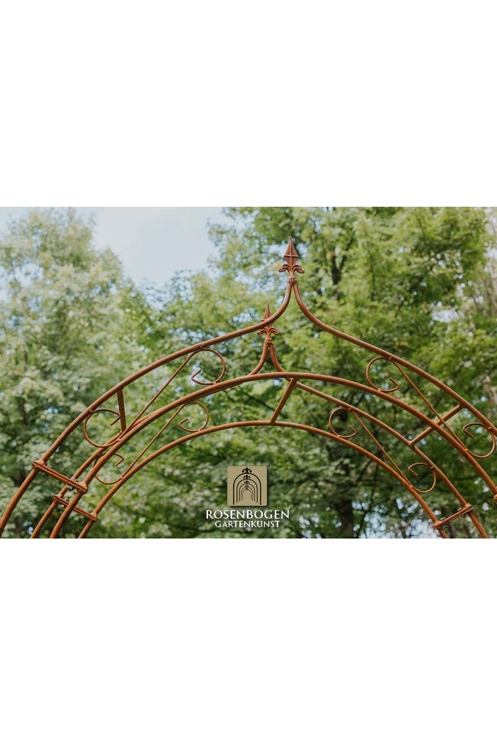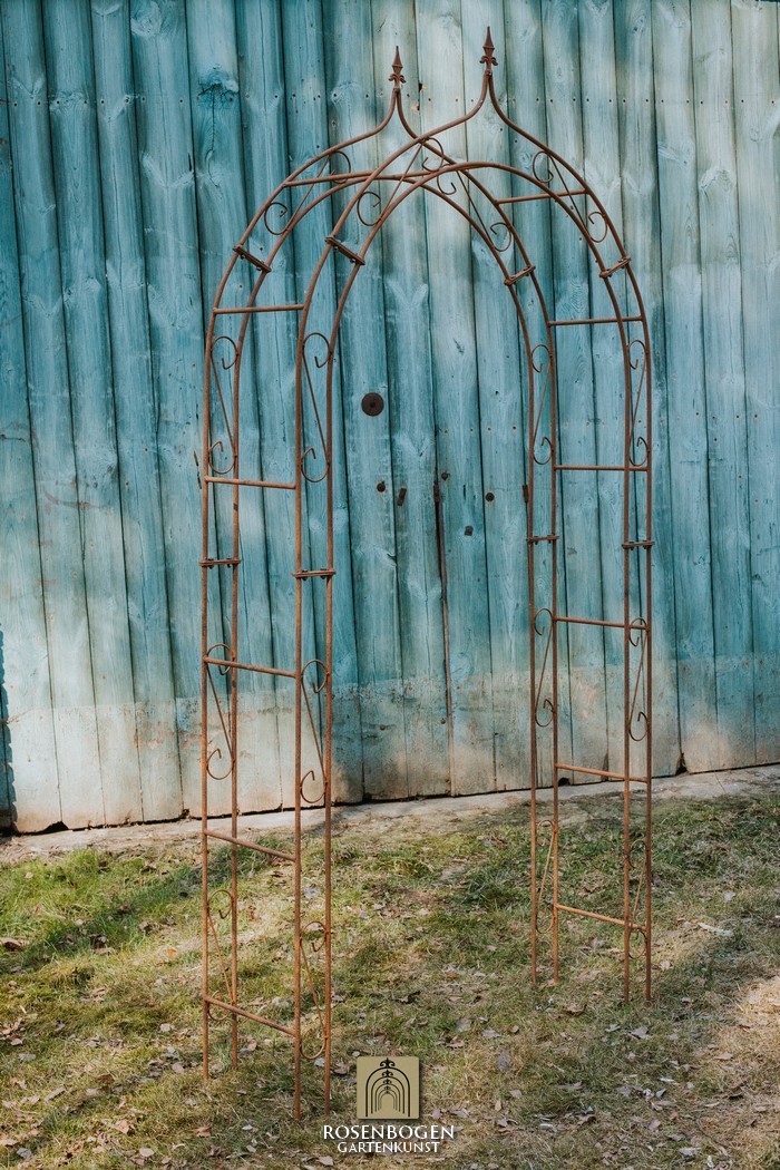 Der Rosenbogen ALEX aus massivem Eisenmetall verleiht Vorgärten eine schöne Optik. Wir bieten den Rosenbogen in der Rost-Optik, in der schwarzen oder verzinkten Version an. Dieser schöne und stabile Rosenbogen aus hochwertigem Metallbogen ist die perfekte Rankhilfe für alle Kletterpflanzen, wie Rosen und andere kletternde Blumen. Die Durchgangshöhe des Rosenbogens ist für jeden ausreichend und wurde in stilechter Handarbeit gefertigt. Die schwungvollen Verzierungen und die stilechte Formgebung gewährleisten viele Gestaltungsmöglichkeiten. Freistehend platziert bietet der Rosenbogen sowohl Zierpflanzen als auch Nutzpflanzen wie Weintrauben einen stabilen Platz an. Er dient auch ohne Bepflanzung als sehr dekoratives Gartenelement und lässt sich wunderbar als Sichtschutz und Statue einsetzen.
