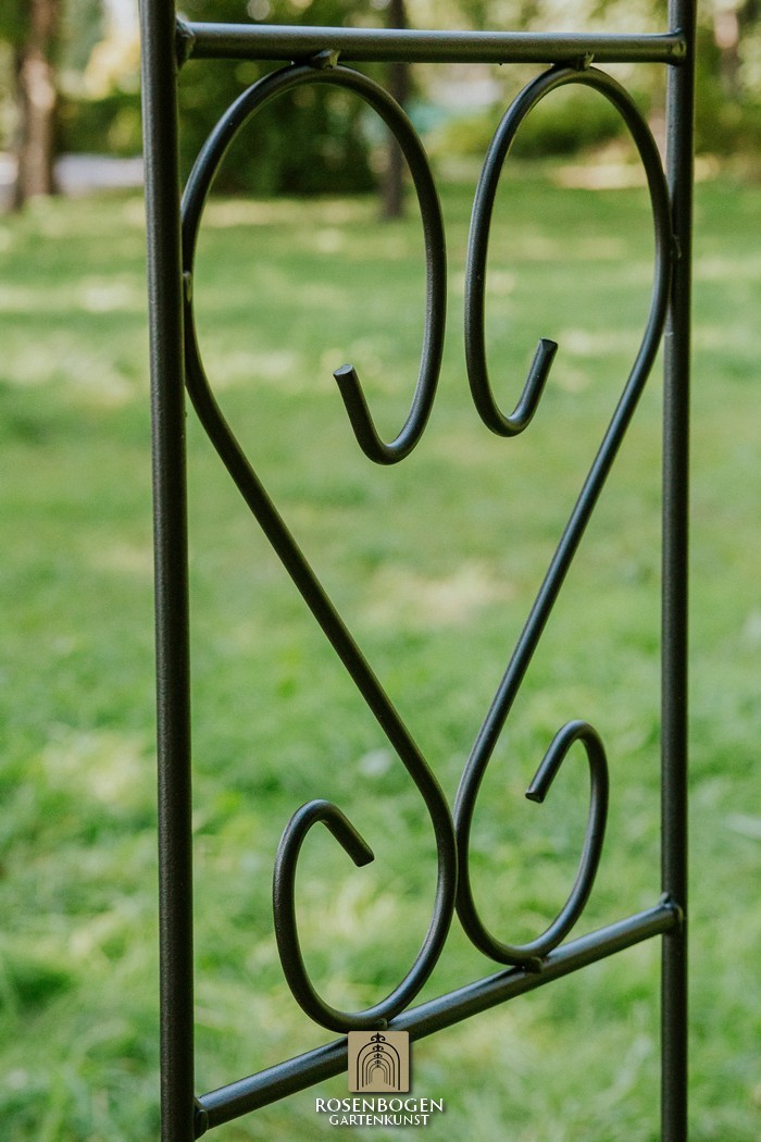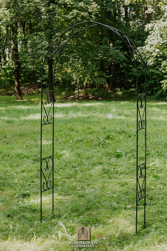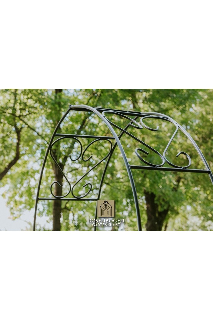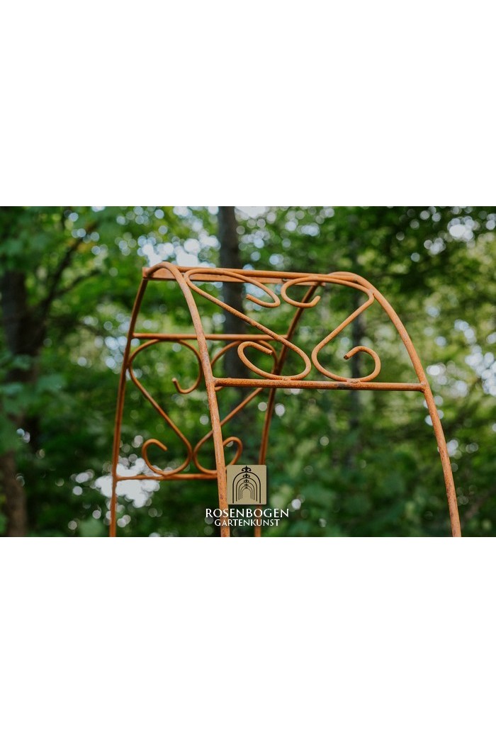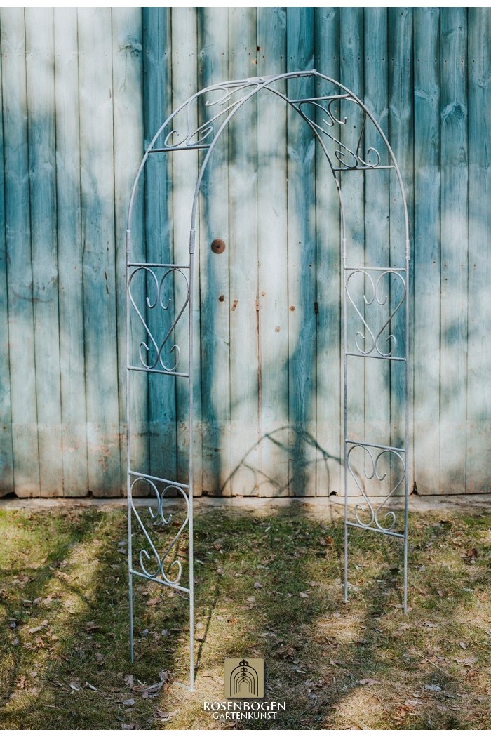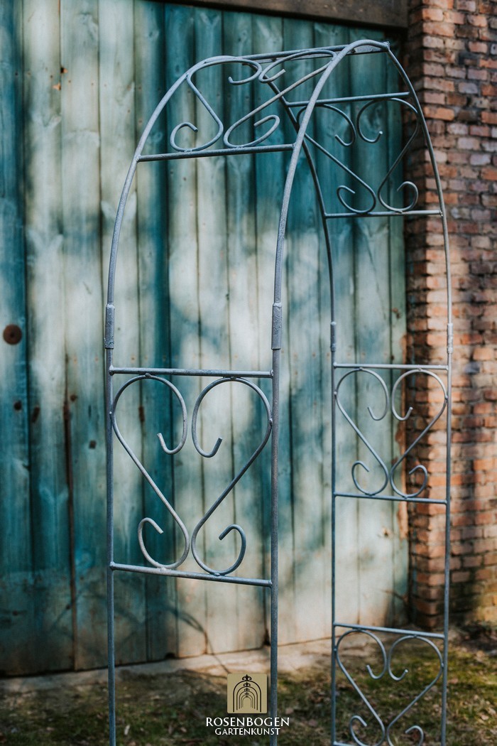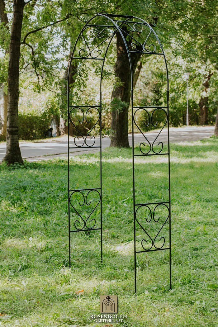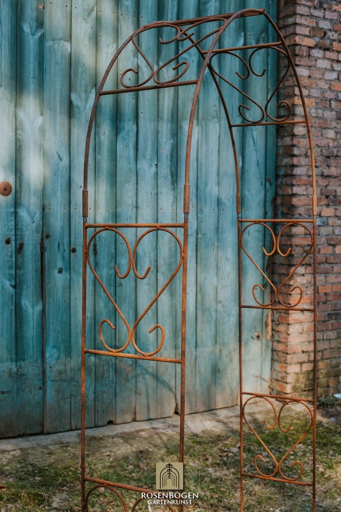 Der Rosenbogen CLARA aus massivem Eisenmetall verleiht Vorgärten ein klassisches Aussehen. Wir bieten den Rosenbogen in der Rost-Optik und in der verzinkten oder schwarzen Version an. Dieser schöne und klassische Rosenbogen aus hochwertigem Metallbogen ist die perfekte Rankhilfe für alle Kletterpflanzen, wie Rosen und andere kletternde Blumen. Die Durchgangshöhe des Rosenbogens ist für jeden ausreichend und wurde in stilechter Handarbeit gefertigt. Die schwungvollen Verzierungen und die stilechte Formgebung gewährleisten viele Gestaltungsmöglichkeiten. Freistehend platziert bietet der Rosenbogen sowohl Zierpflanzen als auch Nutzpflanzen wie Weintrauben einen stabilen Platz. Er dient auch ohne Bepflanzung als sehr dekoratives Gartenelement und lässt sich wunderbar als Sichtschutz und Statue einsetzen.