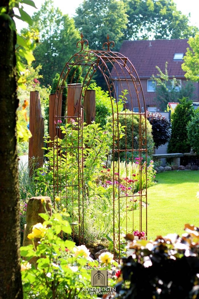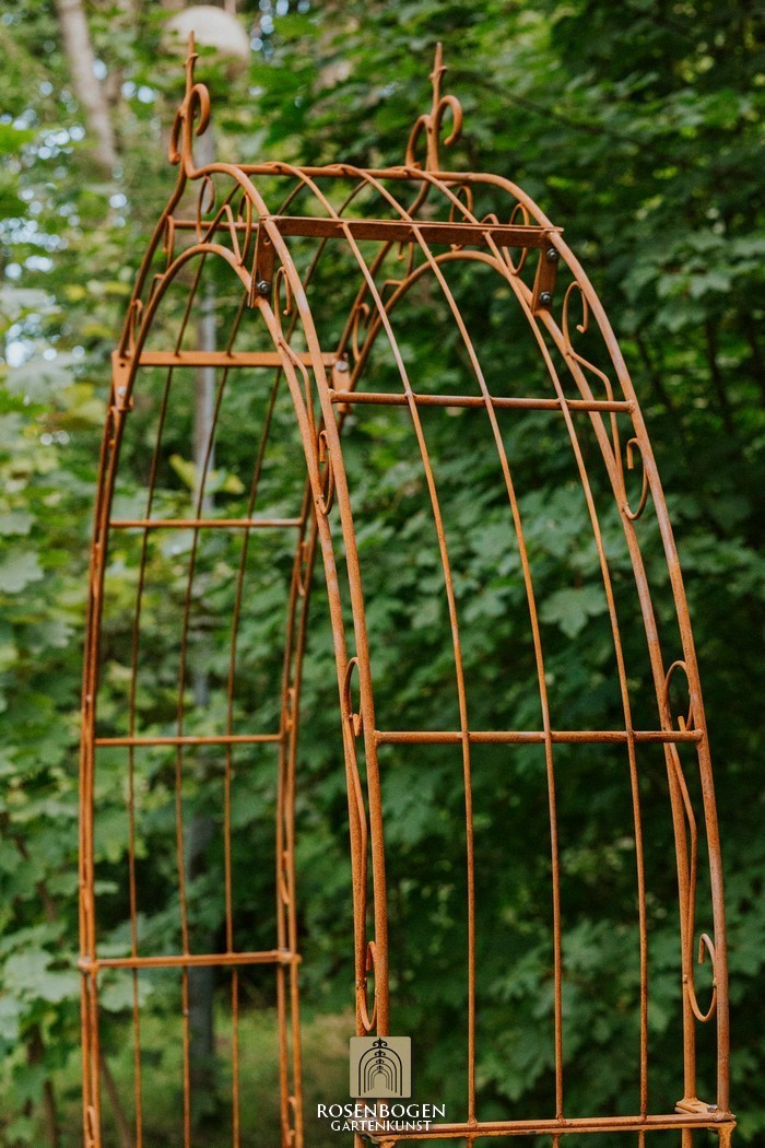 Der Rosenbogen LEA Spitze aus massivem Eisen verleiht Vorgärten ein originelles Aussehen. Wir bieten den Metallbogen in der Rost-Optik, in der schwarzen oder verzinkten Ausführung an. Dieser schöne, hochwertige Metallbogen ist die perfekte Rankhilfe für alle Kletterpflanzen wie z.B. Rosen und Clematis. Die Durchgangshöhe des Rosenbogens ist ausreichend für alle und wurde im eleganten Stil handgefertigt. Die schwungvollen Verzierungen und seine filigrane Form gewährleisten viele Gestaltungsmöglichkeiten. Freistehend platziert bietet der Rosenbogen sowohl Zierpflanzen als auch Nutzpflanzen wie Weintrauben einen stabilen Platz. Er dient auch ohne Bepflanzung als sehr dekoratives Gartenelement und lässt sich wunderbar als Sichtschutz verwenden.