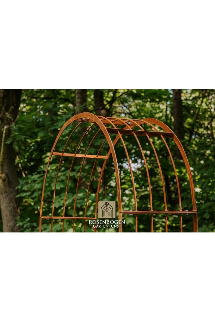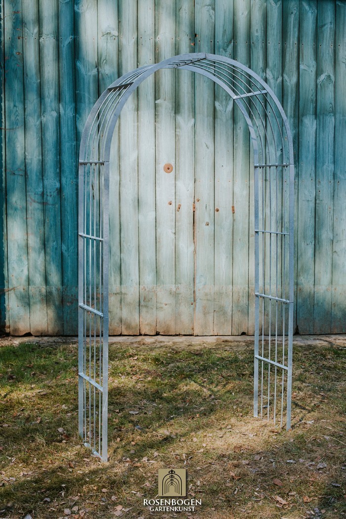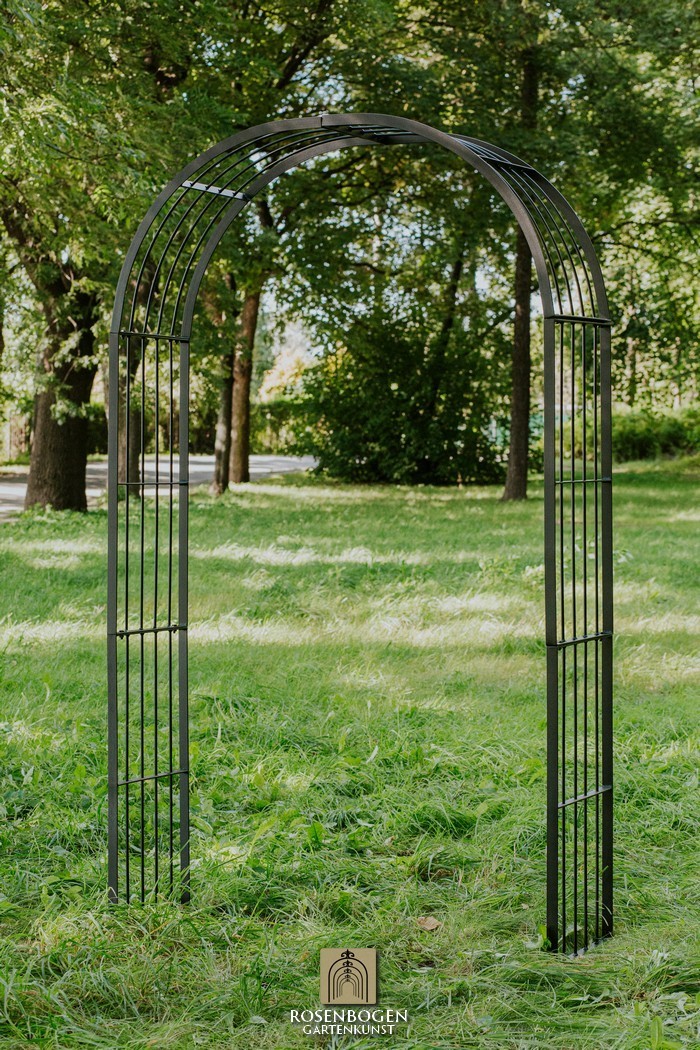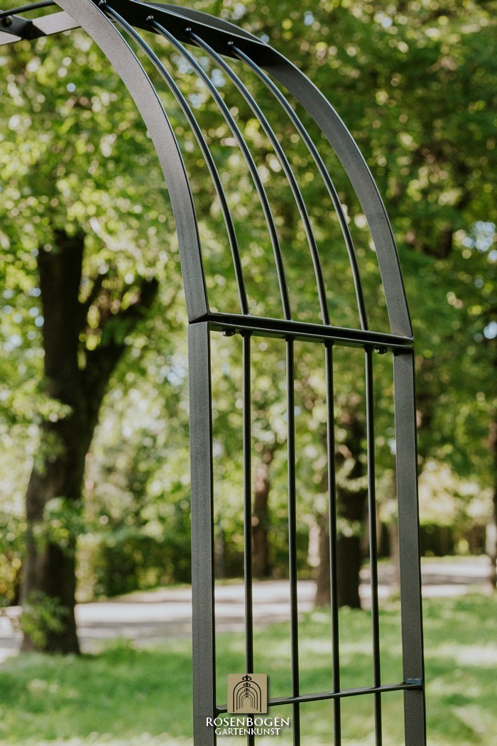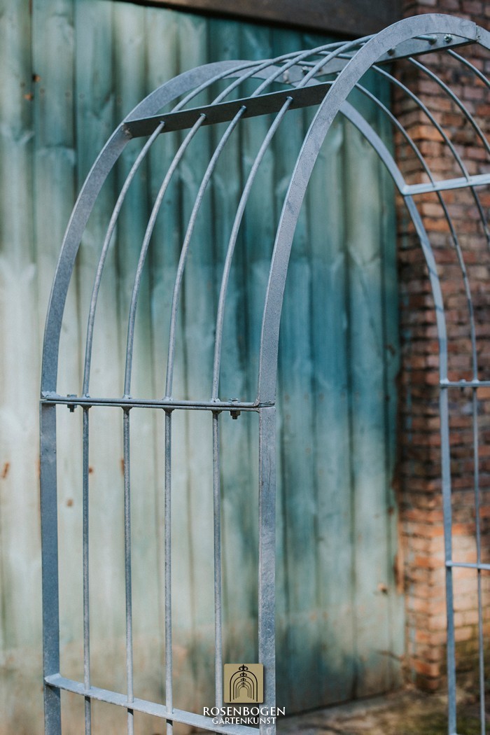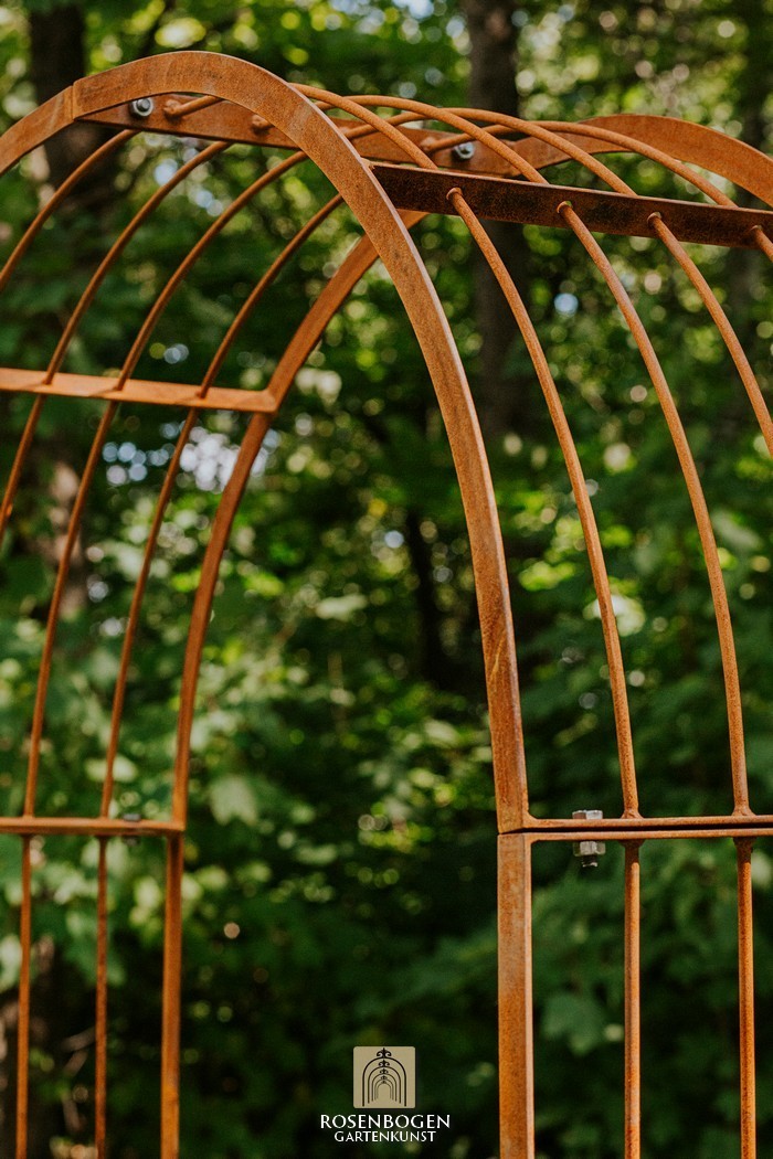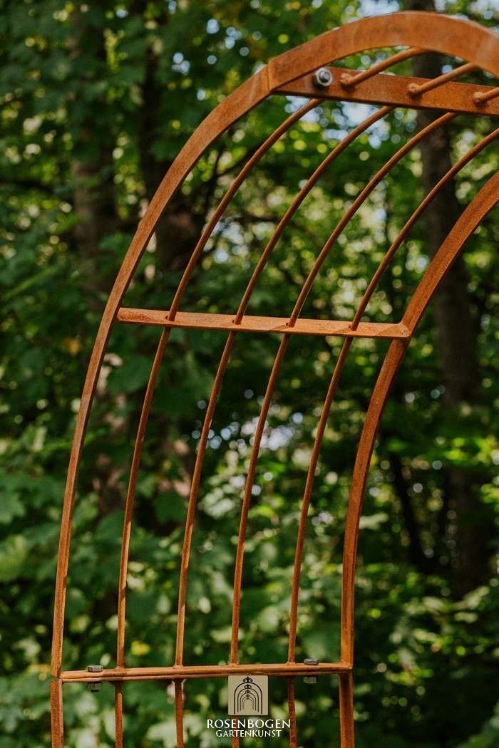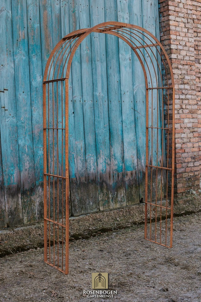 Der Rosenbogen MIA wurde aus stabilem Metall gefertigt und besticht durch seine schlichte Form. Wir bieten den Rosenbogen in der Rost-Optik, in der verzinkten oder schwarzen Version an. Dieser Klassiker und stabile Metall-Rosenbogen aus hochwertigem Metall ist die perfekte Rankhilfe für alle Kletterpflanzen wie Rosen und andere kletternde Blumen. Die Durchgangshöhe des Rosenbogens ist für jeden ausreichend und wurde in stilechter Handarbeit gefertigt. Die schwungvollen Verzierungen und die stilechte Formgebung gewährleisten viele Gestaltungsmöglichkeiten. Freistehend platziert bietet der Rosenbogen sowohl Zierpflanzen als auch Nutzpflanzen wie Weintrauben einen stabilen Platz. Er dient auch ohne Bepflanzung als sehr dekoratives Gartenelement und lässt sich wunderbar als Sichtschutz und Statue einsetzen.