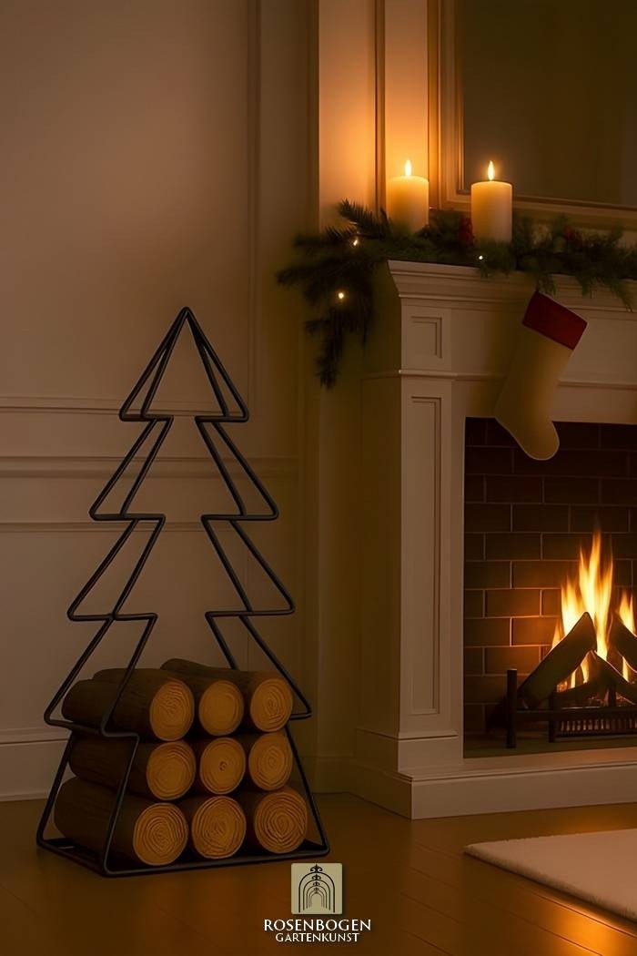 Dieses moderne Brennholzregal wird sofort zum dekorativen Blickfang und schafft eine warme, elegante Atmosphäre – perfekt für die Winter- und Weihnachtszeit.