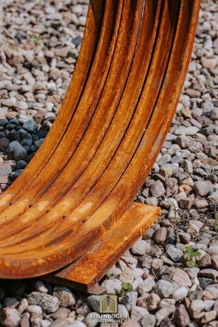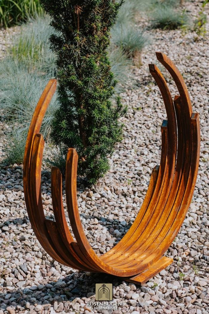 Die rostfarbene Patina integriert sich perfekt in natürliche Gartenumgebungen – ob in Kiesbeeten, zwischen Ziergräsern oder als eigenständige Skulptur auf dem Rasen. Pinio steht sicher und kann das ganze Jahr über im Freien bleiben.