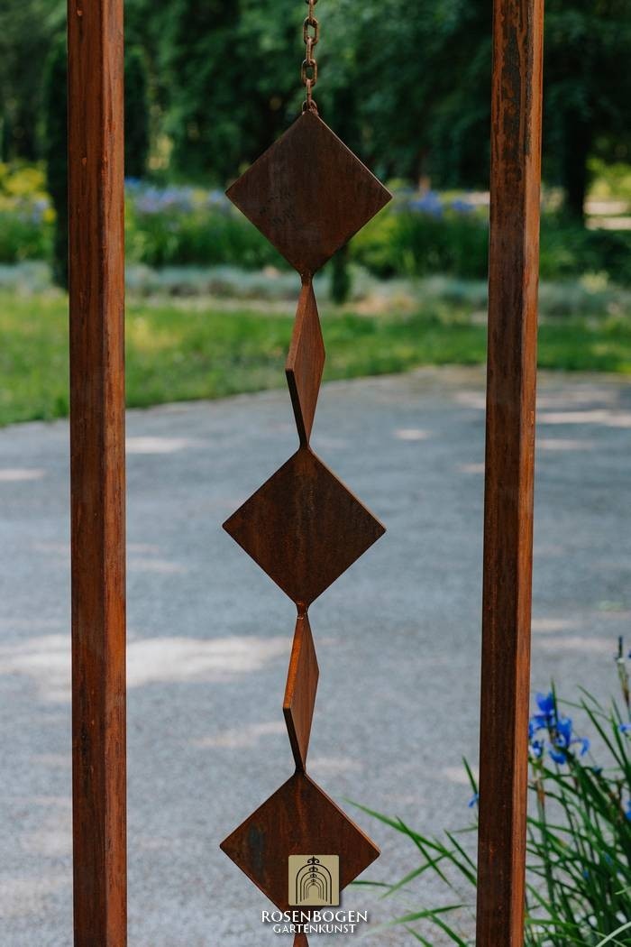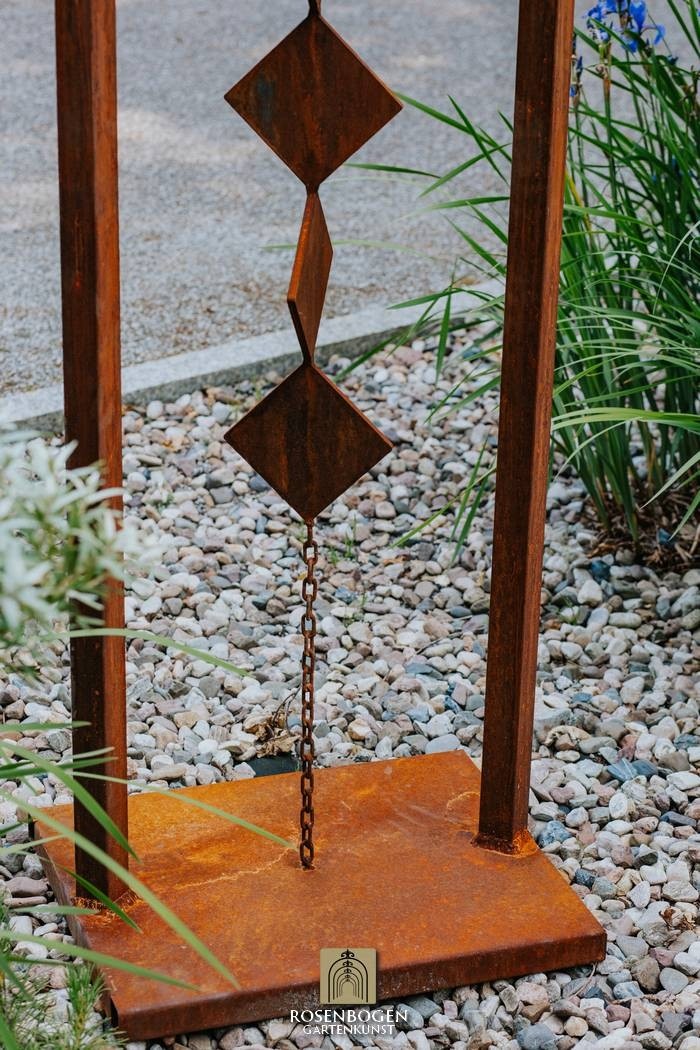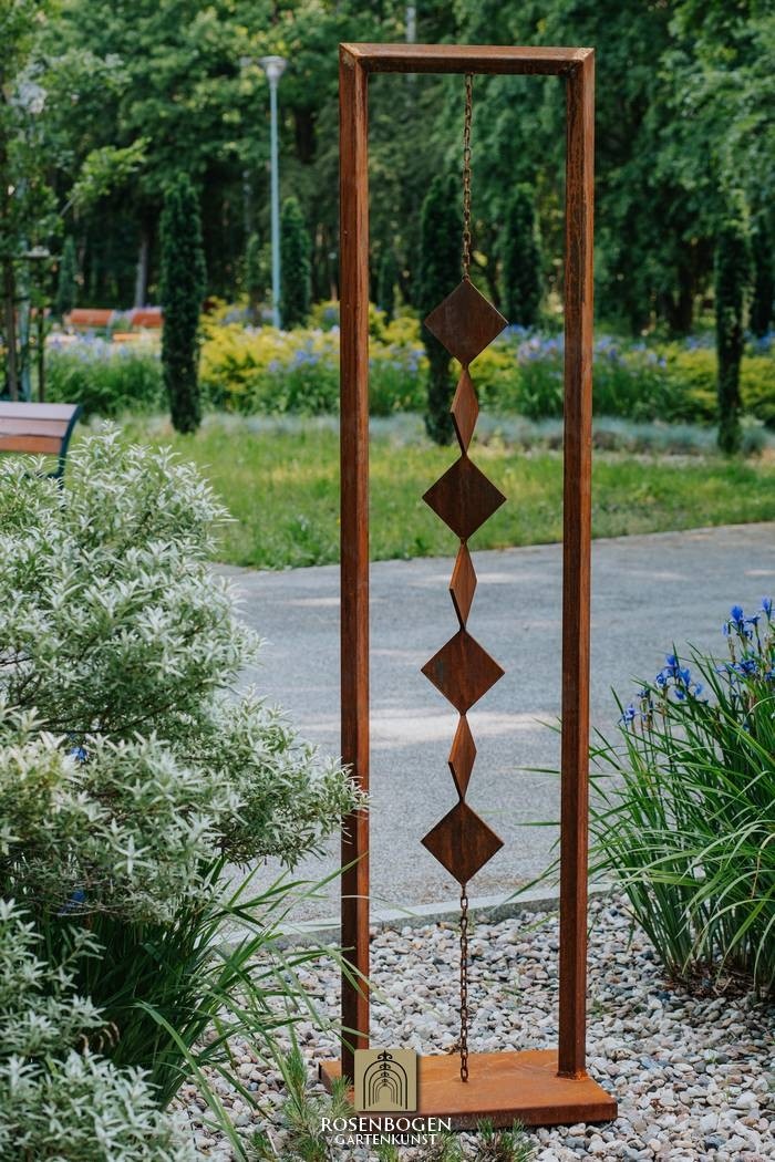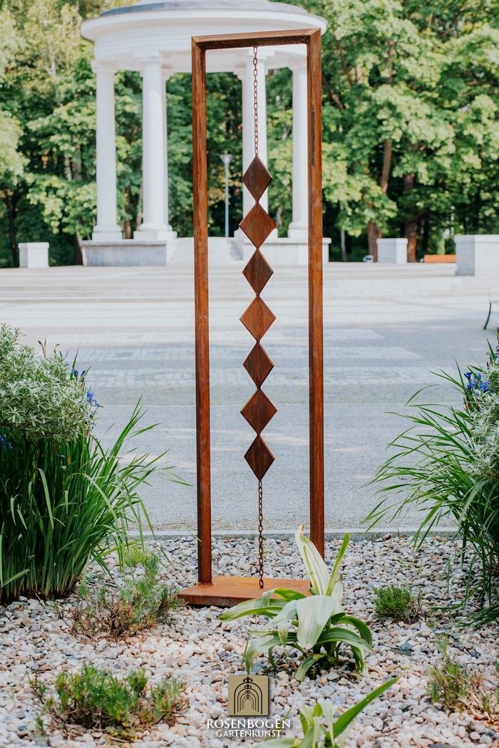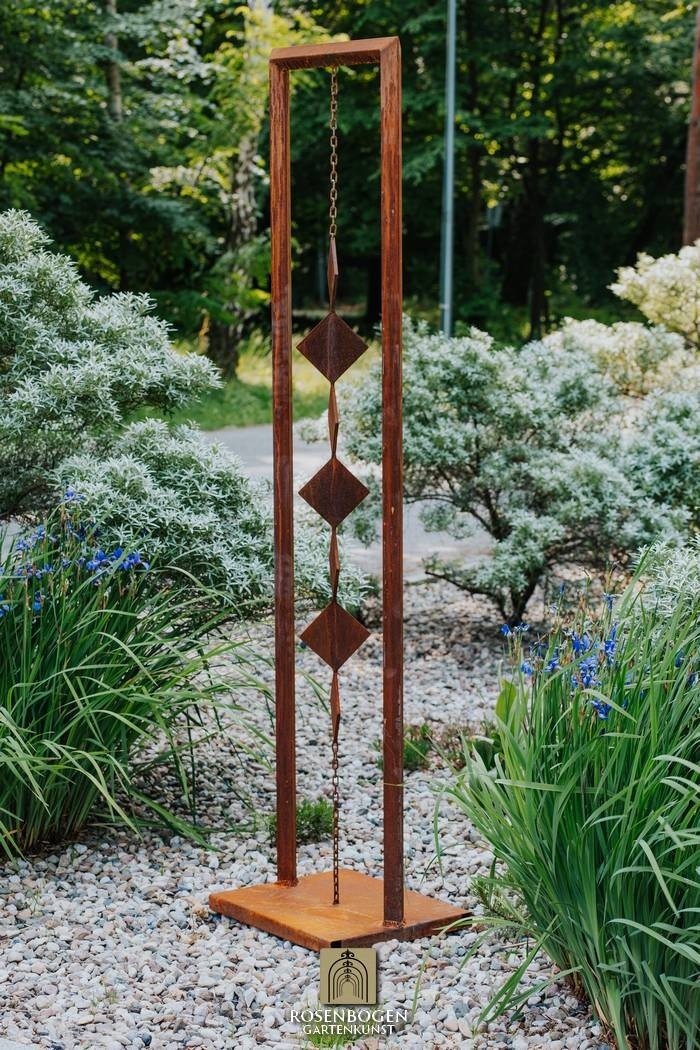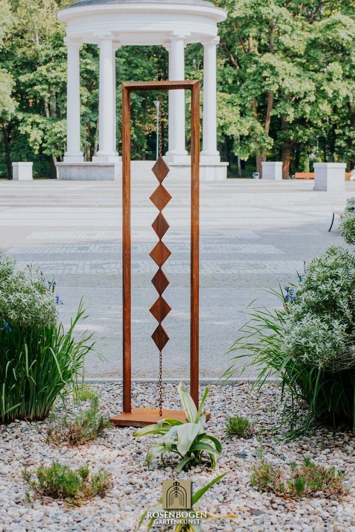 Das Stahlgestell aus 40x40 mm Profil ist fest auf einer Bodenplatte verankert und trägt eine vertikale Kette mit präzise angeordneten, rautenförmigen Elementen. Diese bewegen sich sanft im Wind und verleihen der ansonsten strengen Form eine poetische Leichtigkeit. Das Objekt wiegt 20 kg und steht sicher auf jeder ebenen Fläche.