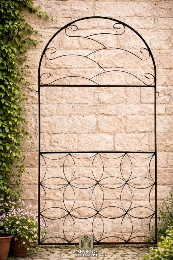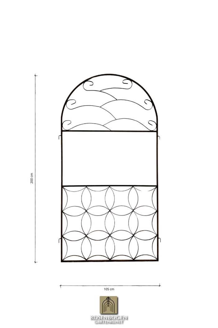 Seitenwand Ferrum B ist ein dekoratives Erweiterungselement für die Pavillons der Ferrum Serie. Mit den Maßen 200 × 105 cm und einem Gewicht von 11,5 kg ergänzt sie den Pavillon um eine stabile Rankstruktur für Pflanzen. Gefertigt aus 6 mm Rundstahl, Profil 15 × 15 mm und Flachstahl 15 × 3 mm