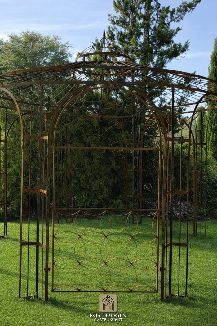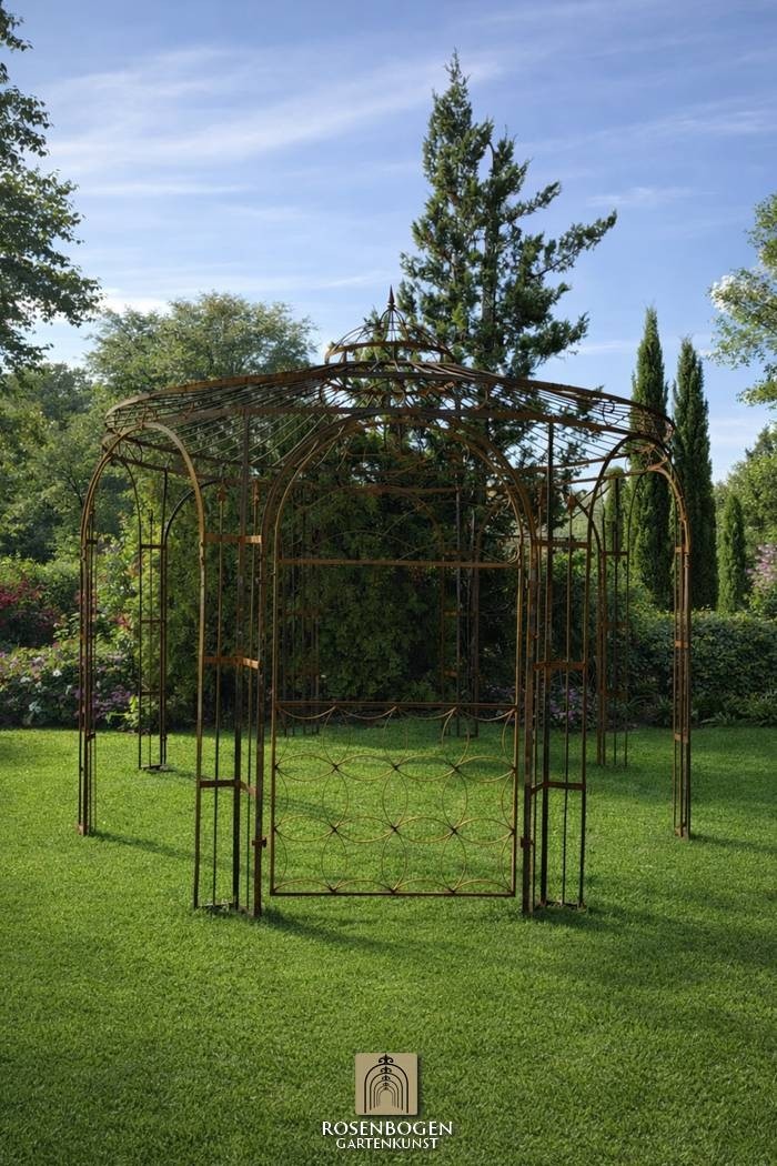 Die Seitenwand eignet sich hervorragend als Rankhilfe für Kletterpflanzen. Rosen, Clematis oder Wein können sich entlang der Struktur entwickeln und verwandeln den Pavillon mit der Zeit in eine üppig begrünte Gartenarchitektur.